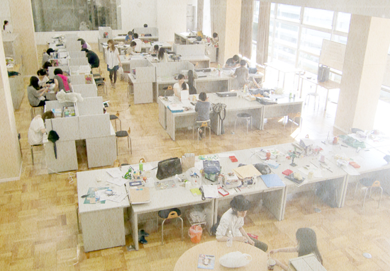 | ストーリーマンガコースの一クラスは、2006年度のマンガ学部創立の際、64名となりました。 それを2クラスに分けて指導することも当初考えられましたが、マンガはとてもパーソナルなものであり 講師によって作品評価が分かれることは当然のことなので、それぞれの講師との接触が偏ることのないよう、大人数クラスのままにしました。 64名は留学生や編入生・研究生の増加により、ときに70名近くなることもあります。 コースの学生には120×70cmの大きな机が個々に与えられ、それがずらりと並ぶ教室は圧巻です。 寒い時期、暑い時期には大学での制作が快適で、居残りを申請し、夜遅くまで制作に励む学生も、少なくありません。 |